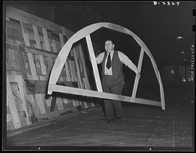 - Wooden templates are used as patterns for the laying out of a number of steel plates. This worker is carrying the templates for a gun foundation from the mold loft to the plate working section. All parts are prefabricated in this huge Eastern plant which formerly turned out freight cars. The completed sections are then carried six miles to the ways on flat cars. Bethlehem-Fairfield Shipyards Inc., Baltimore, Maryland