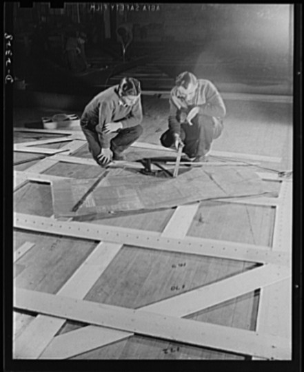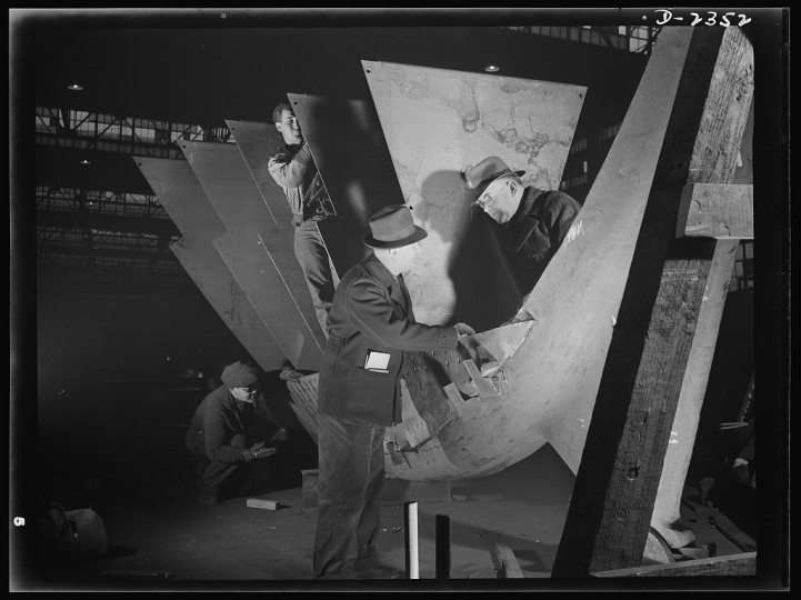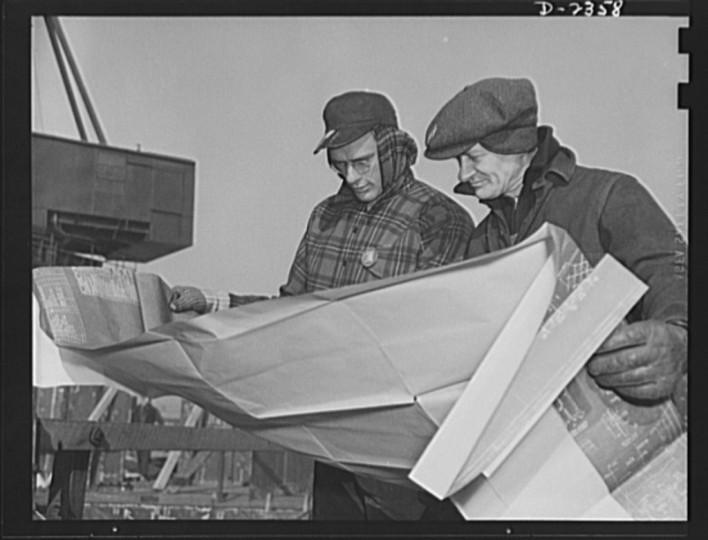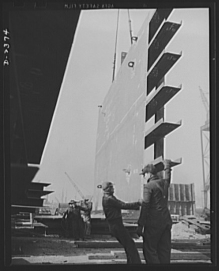 - Here a shipfitter and a crew foreman check the plans to make certain they properly locate a prefabricated section for a new ship, part of Uncle Sam's "Liberty Fleet," under construction at a large Eastern yard. Bethlehem- Fairfield Shipyards Inc., Baltimore, Maryland