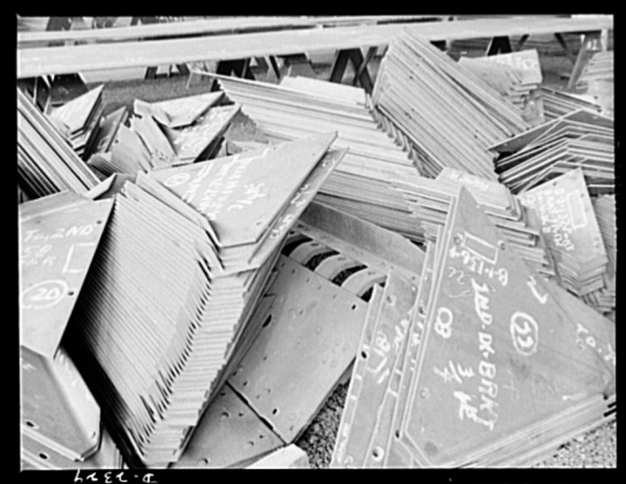 - Steel plates of wasteless dimensions stacked ready for laying out, one of the first operations on the production line of multiply cargo ship construction. All parts are prefabricated in this huge Eastern plant which formerly turned out freight cars. The completed sections are then carried six miles to the ways on flat cars. Bethlehem-Fairfield Shipyards Inc., Baltimore, Maryland