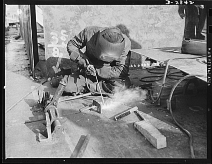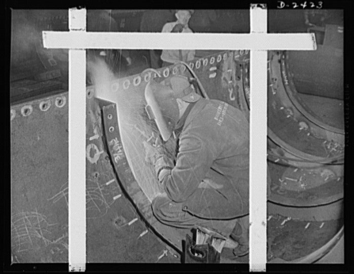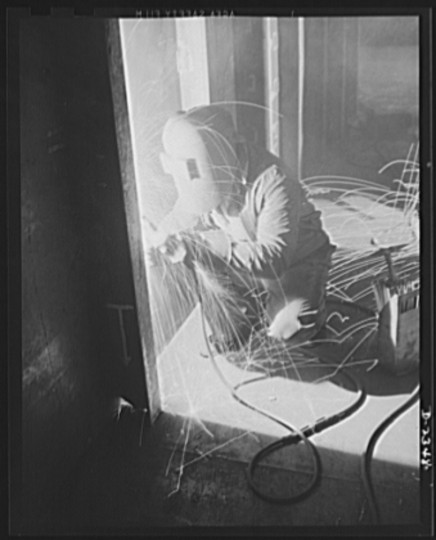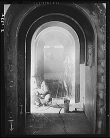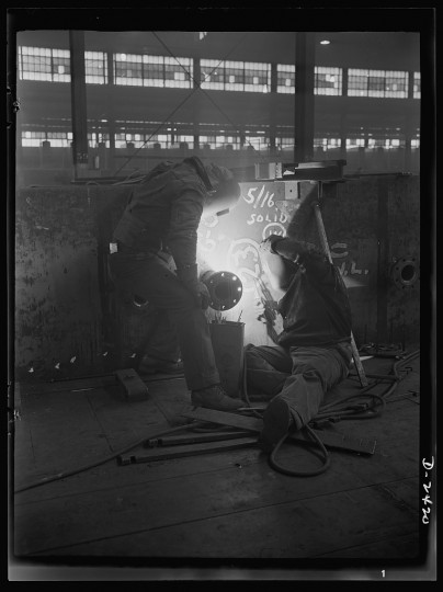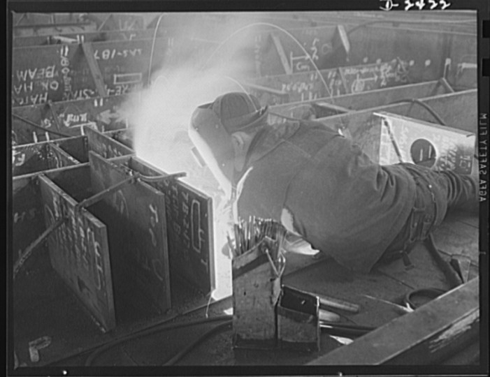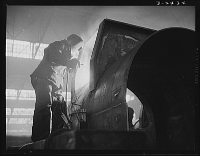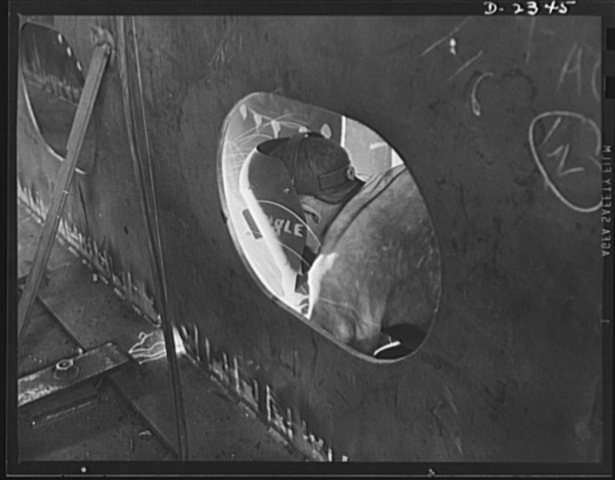 - Welding is one of the most important advances of the century in shipbuilding, saving time, steel and weight. This welder is working on the inside of a fuel tank in a ship of Uncle Sam's new "Liberty Fleet." All parts are prefabricated in this huge Eastern plant which formerly turned out freight cars. The completed sections are then carried six miles to the ways on flat cars. Bethlehem-Fairfield Shipyards Inc., Baltimore, Maryland