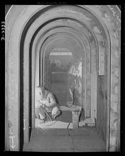 - Welding is more important than ever before in shipbuilding, saving time, weight and steel. This welder is working on the foundation for steel pillars to support the decks on top of the shaft tunnel of a new merchant ship under construction at a large Eastern plant. All parts are prefabricated in this huge Eastern plant which formerly turned out freight cars. The completed sections are then carried six miles to the ways on flatcars. Bethlehem-Fairfield Shipyards Inc., Baltimore, Maryland