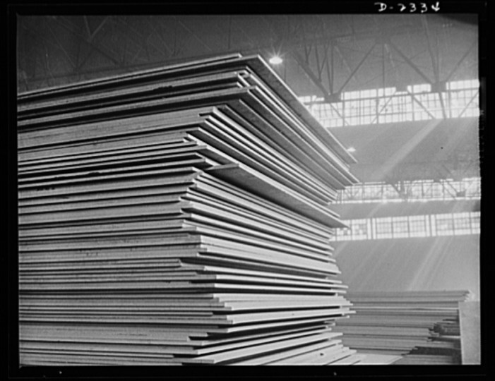 - These stacks of steel plate are in readiness for an uninterrupted flow toward the production line of a large Eastern plant fabricating sections for ships built at a nearby yard. This plant was formerly used for Pullman car construction. Bethlehem-Fairfield Shipyards Inc., Baltimore, Maryland