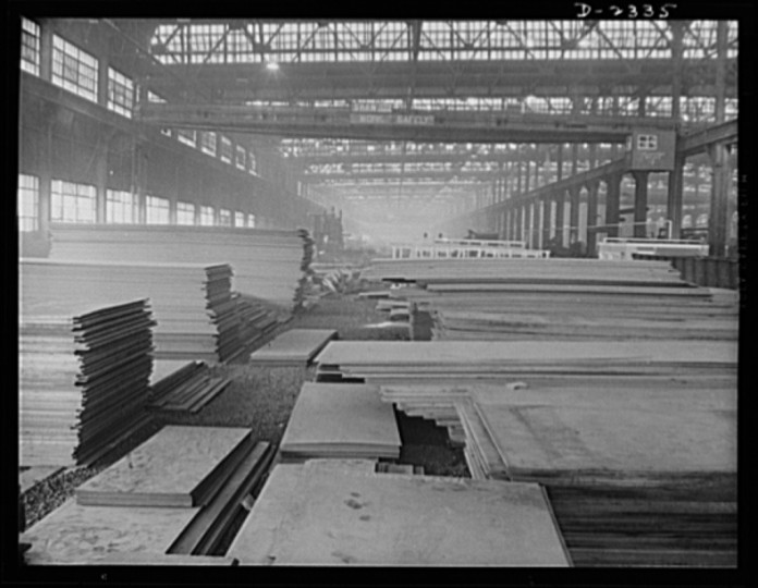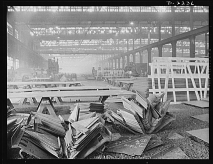 - These stacks of steel plate are in readiness for an uninterrupted flow toward the production line of a large Eastern plant fabricating sections for ships built at a nearby yard. This plant was formerly used for freight car construction. All parts are prefabricated in this huge Eastern plant which formerly turned out freight cars. The completed sections are then carried six miles to the ways on flat cars. Bethlehem-Fairfield Shipyards, Inc., Baltimore, Maryland 1941