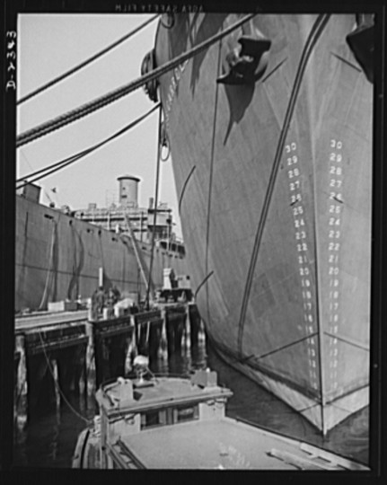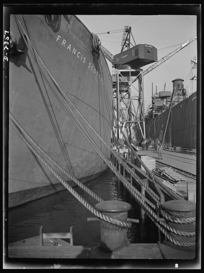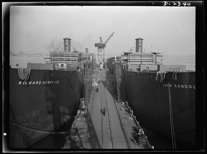 - Here are two members of the Liberty Fleet lying at anchor in the basin of a large Eastern shipyard, awaiting final fitting and rigging