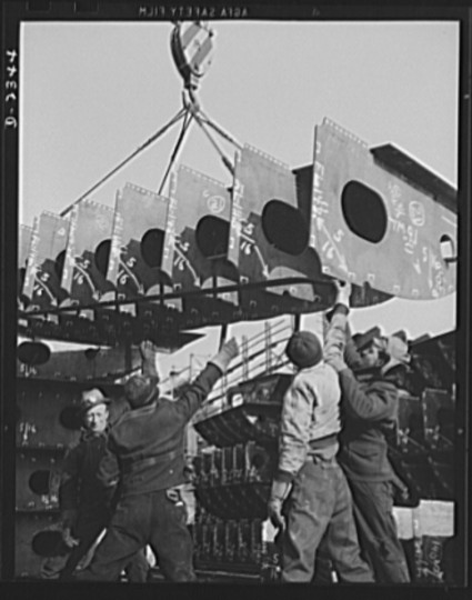 - All assembled and ready to go in place. Prefabrication of sections such as this in a nearby plant formerly making freight cars saves weeks in the building of ships for Uncle Sam's new merchant fleet. This piece is being hoisted into place, and soon the welder will begin his vital work. Bethlehem-Fairfield Shipyards Inc., Baltimore, Maryland