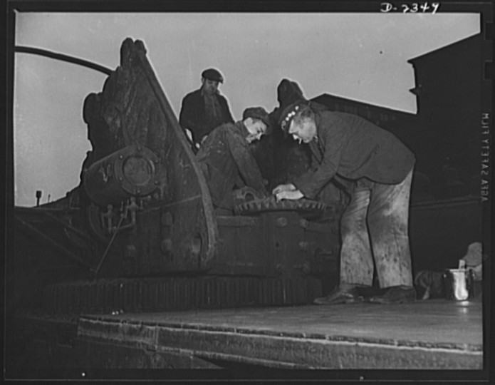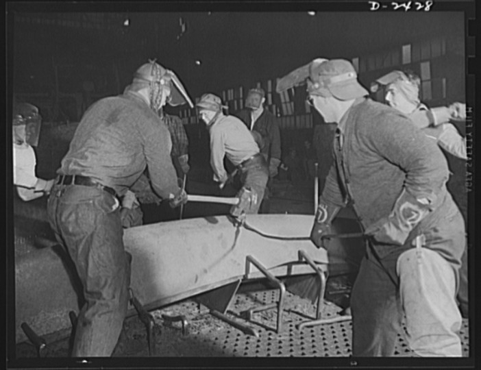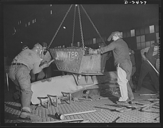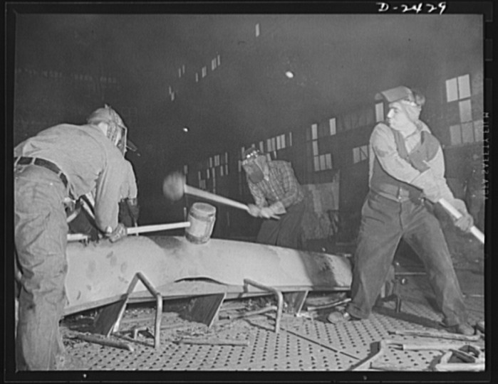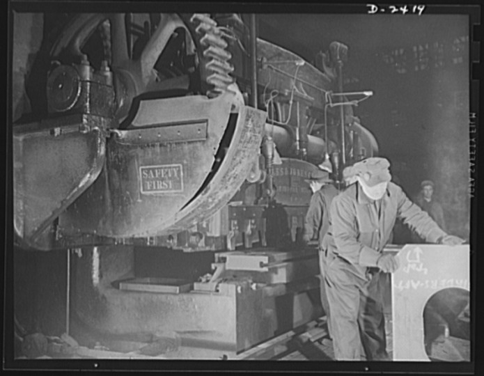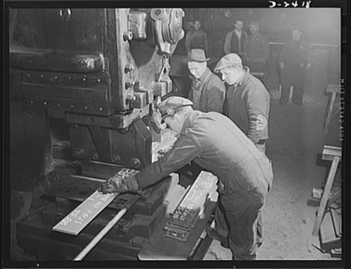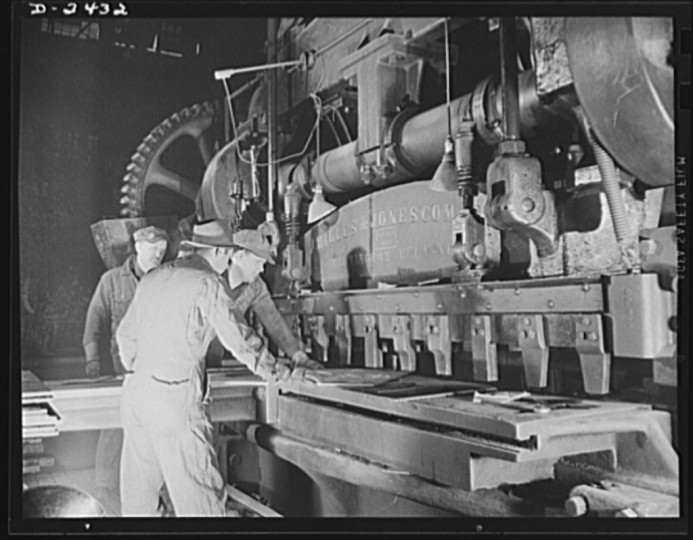 - Workers at a prefabricating plant turn out steel parts for a large Eastern shipyard building units of Uncle Sam's "Liberty Fleet." Here they operate a giant shear. This plant was originally used to produce freight cars, and the shears are part of the plant's original equipment. All parts are prefabricated in this huge Eastern plant which formerly turned out freight cars. The completed sections are then carried six miles to the ways on flatcars. Bethlehem-Fairfield Shipyards Inc., Baltimore, Maryland