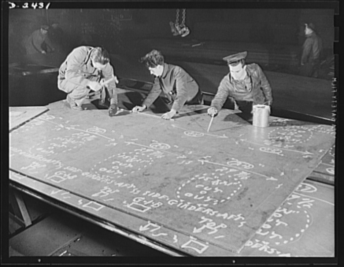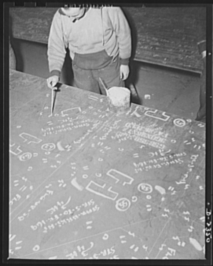 - This worker in the mold loft is painting over the marks made on steel plates from wooden templates, or patterns. The original marking is scratched onto the steel, and this man brings them out in white. All parts are prefabricated in this huge Eastern plant which formerly turned out freight cars. The completed sections are then carried six miles to the ways on flat cars. Bethlehem-Fairfield Shipyards Inc., Baltimore, Maryland