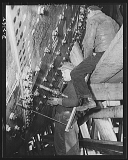 - Shell plates of a ship at the bow, where the inner plates are first bolted to the outer plates for added strength. The rivets are countersunk to be flush on the outer side. Production scene in a large Eastern shipyard. Bethlehem-Fairfield Shipyards Inc., Baltimore, Maryland