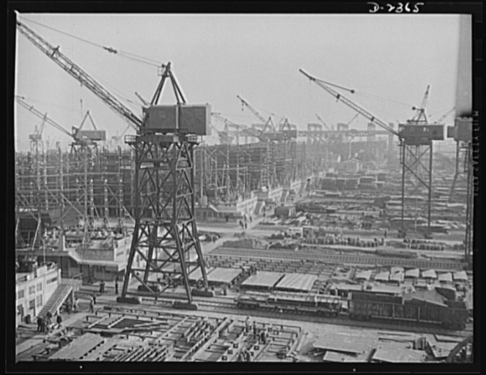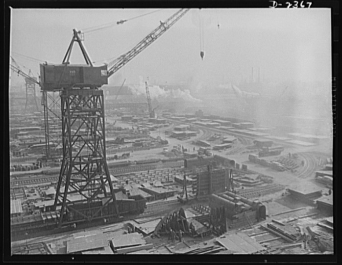 - This maze of rolling cranes, at a large Eastern shipyard is a typical scene in many large shipyards at work on ships for Uncle Sam's Navy and merchant fleet. Stocks of material are piled up for the cranes to take to vessels under construction so there is no delay in production while waiting for sections or materials. All parts are prefabricated in this huge Eastern plant which formerly turned out freight cars. The completed sections are then carried six miles to the ways on flat cars. Bethlehem-Fairfield Shipyards Inc., Baltimore, Maryland