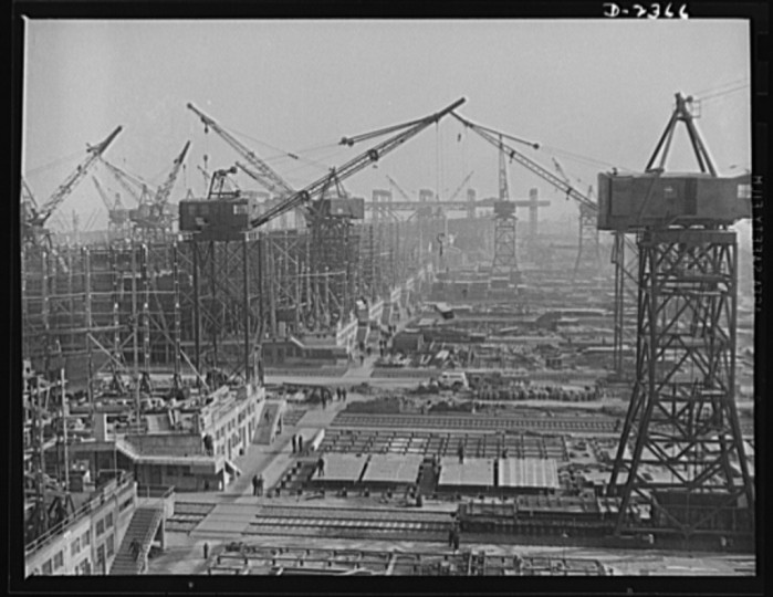 - This maze of rolling cranes, at a large Eastern shipyard is a typical scene in many large shipyards at work on ships for Uncle Sam's Navy and merchant fleet. Stocks of material are piled up for the cranes to take to vessels under construction so there is no delay in production while waiting for sections or materials. All parts are prefabricated in this Eastern plant which formerly turned out freight cars. The completed sections are then carried six miles to the ways on flat cars. Bethlehem-Fairfield Shipyards Inc., Baltimore, Maryland