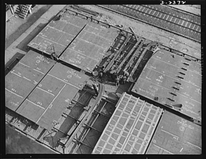 - A new vessel has just moved off these ways, and the keel is being assembled for yet another in a large Eastern shipyard. The bottom and side shell plating and the inner tank sections are being assembled. All parts are prefabricated in this huge Eastern plant which formerly turned out freight cars. The completed sections are then carried six miles to the ways on flat cars