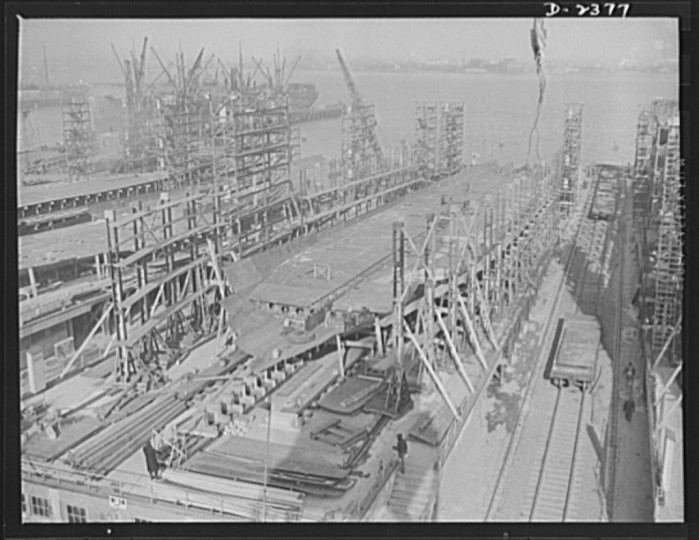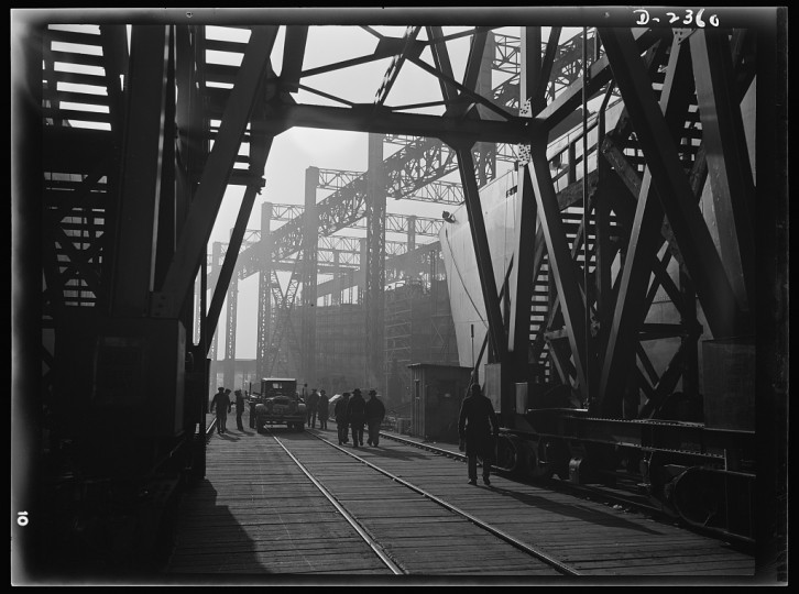 - Between the ways of this large Eastern shipyard run tracks for flat cars carrying materials or sections to be hoisted onto the deck of ships under construction