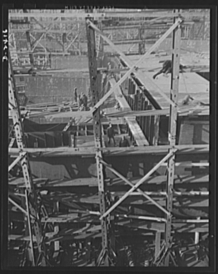 - This is the midship section of a new member of the Liberty Fleet, nearing completion at a large shipyard. In the background is a maze of scaffolding and cranes typical of the scene in many large American shipyards as builders work to make Uncle Sam master of the seas