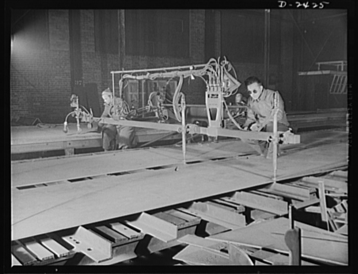 - This is a travograph-oxy-acetylene machine, a cutter which treads its own pattern. Here it is cutting two identical floor plates for a tank section at the bottom of a new member of the "Liberty Fleet." The work is done at what was formerly a freight car plant now a large Eastern plant. All parts are prefabricated in this huge Eastern plant which formerly turned out freight cars. The completed sections are then carried six miles to the ways on flatcars. Bethlehem-Fairfield Shipyards Inc., Baltimore, Maryland
