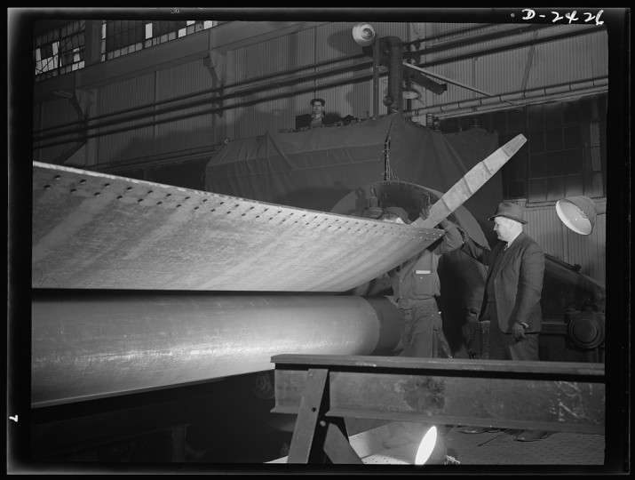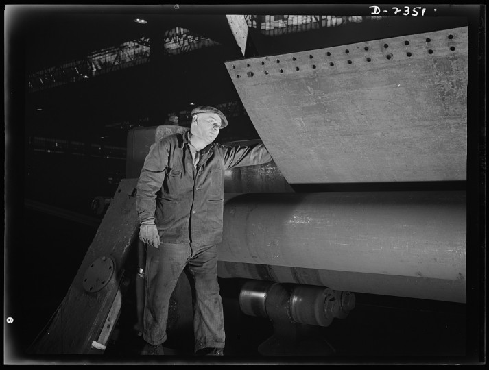 - This worker is watching for signals from a colleague as he rolls cold steel plate to a desired shape on this plate roller, designed in Germany. All parts are prefabricated in this Eastern plant which formerly turned out freight cars. The completed sections are carried to the ways on flat cars. Bethlehem-Fairfield Shipyards Inc., Baltimore, Maryland