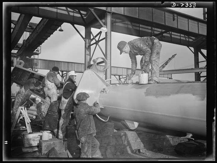 - Welding is more important than ever before in shipbuilding, saving time, weight and steel. This work is done at a nearby plant which formerly turned out freight cars. These workers are doing a dual welding operation on fuel oil tanks for the bottom of a "Liberty Ship" under construction at a large Eastern yard. All parts are prefabricated in this huge Eastern plant which formerly turned out freight cars. The completed sections are then carried six miles to the ways on flatcars. Bethlehem-Fairfield Shipyards Inc., Baltimore, Maryland