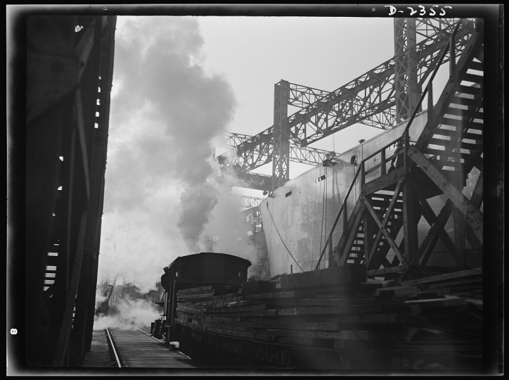 - Most large shipyards have their own rail systems, with several locomotives and flat cars used for hauling heavy ship parts about the yards. This man operates such a locomotive transporting completed sections from a former freight car plant six miles to the ways where they are assembled into completed ships. All parts are prefabricated in this huge Eastern plant which formerly turned out freight cars. The completed sections are then carried six miles to the ways on flat cars. Bethlehem-Fairfield Shipyards Inc., Baltimore, Maryland