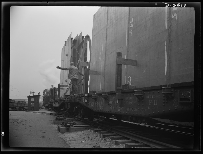 - Use of a former Pullman car plant for the prefabrication of many sections used in the ships being built at a nearby yard means the saving of many valuable months in our shipbuilding program. This man is a brakeman on a train carrying assembled sections from the plant to the yard. All parts are prefabricated in this huge Eastern plant which formerly turned out freight cars. The completed sections are then carried six miles to the ways on flat cars. Bethlehem-Fairfield Shipyards Inc., Baltimore, Maryland