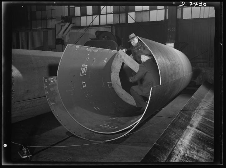 - These are rolled plates for the shaft tunnel of one of Uncle Sam's new "Liberty Ships," under construction at a large Eastern shipyard. All parts are prefabricated in this large Eastern plant which formerly turned out freight cars. The completed sections are then carried six miles to the ways on flatcars. Bethlehem-Fairfield Shipyards Inc., Baltimore, Maryland